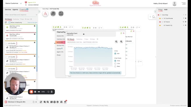 The platform automatically discovers and classifies devices across complex networks, mapping them both geospatially and topologically to show how systems are connected and performing. It continuously monitors device health, connectivity, and performance across multi-vendor environments while using AI to analyze camera image quality and detect degradation before it impacts visibility.